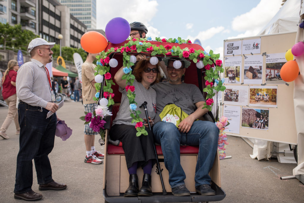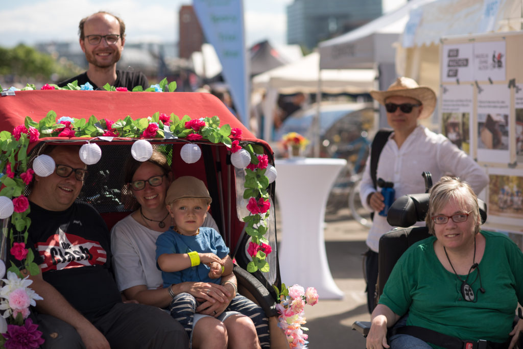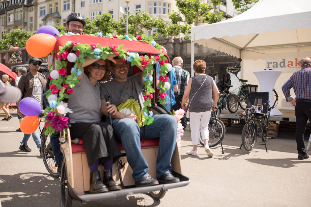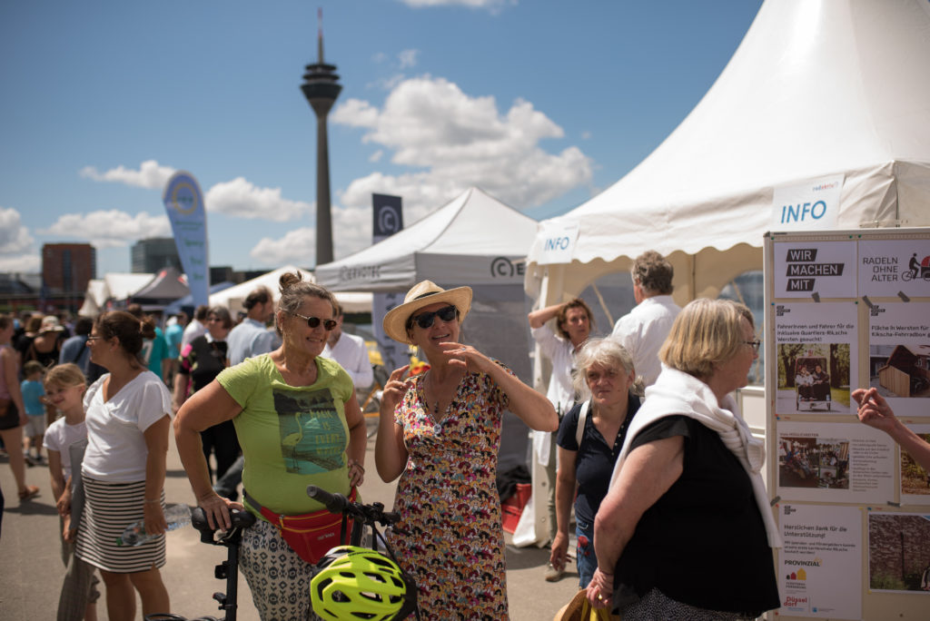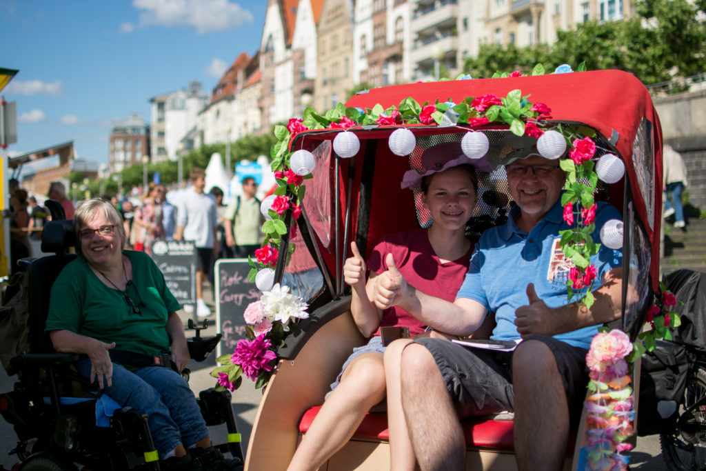 „Wie ein Urlaub auf Mallorca!“ – „Wir machen mit!“ stellt die inklusive Stadtteil-Rikscha auf dem Radaktiv-Tag am Mannesmannufer vor.