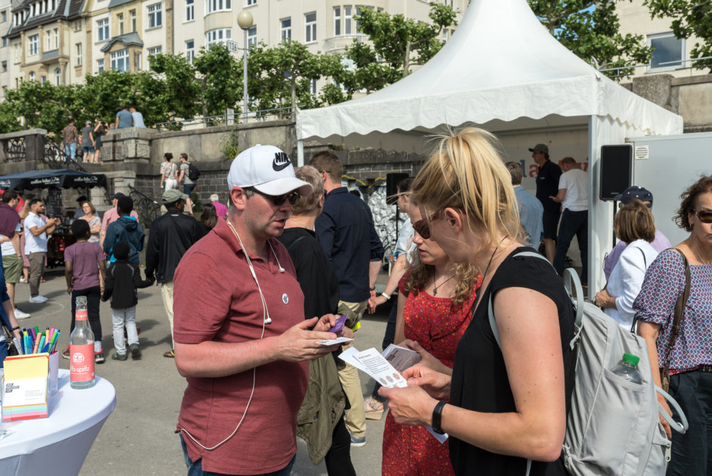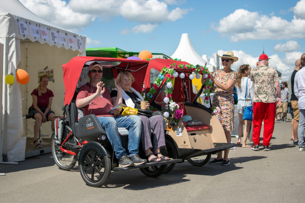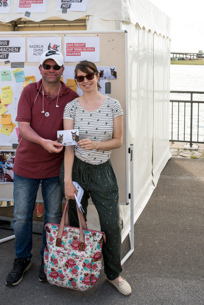Benjamin Freese, Projektkoordinator „Wir machen mit!“, hat sich an diesem Tag als Rikscha-Fahrer betätigt und brauchte nicht lange zu warten, bis sich die ersten Besucherinnen und Besucher mit der, bis jetzt noch namenlosen, Rikscha am Rhein entlangfahren ließen. „Wir brauchten niemanden überzeugen, eine kleine Runde mit der Rikscha zu drehen“, so Benjamin Freese. Unter dem Motto „Drahtesel für Alle“ wurde das Projekt „Radeln ohne Alter“ vorgestellt und darauf geachtet, dass Menschen jeden Alters zu einer Fahrt mit der barrierefreien Rikscha eingeladen werden.