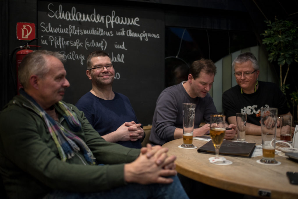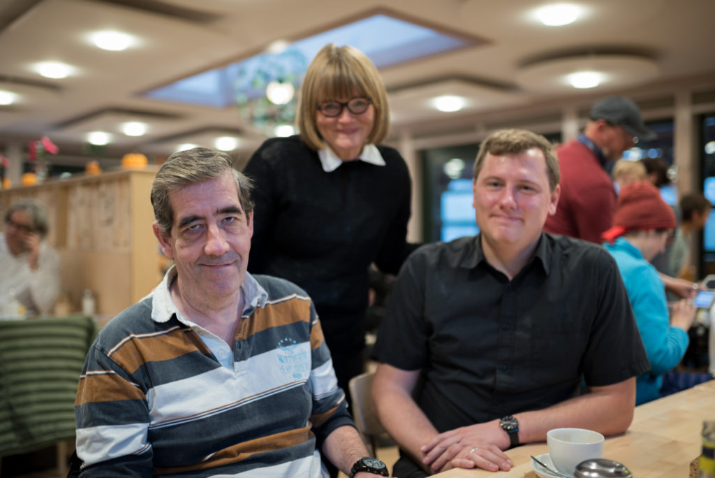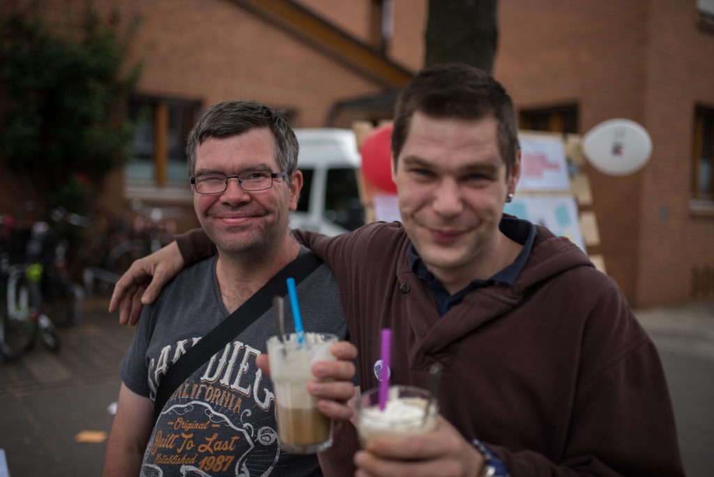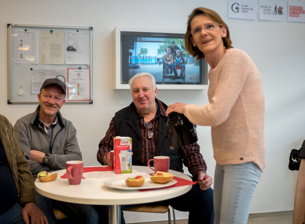Die beiden Fahrgäste leben in eigenen Wohnungen in Düsseldorf Lierenfeld und werden dabei von der IGL (In der Gemeinde leben gGmbH) unterstützt. Auch aus dem Matthias-Claudius-Haus, einer Wohneinrichtung für Menschen mit Behinderung, sind zwei Bewohner mitgekommen. Sie sind gemeinsam mit ihrer Begleitung zum Café gelaufen und freuen sich ebenfalls über die Stärkung.