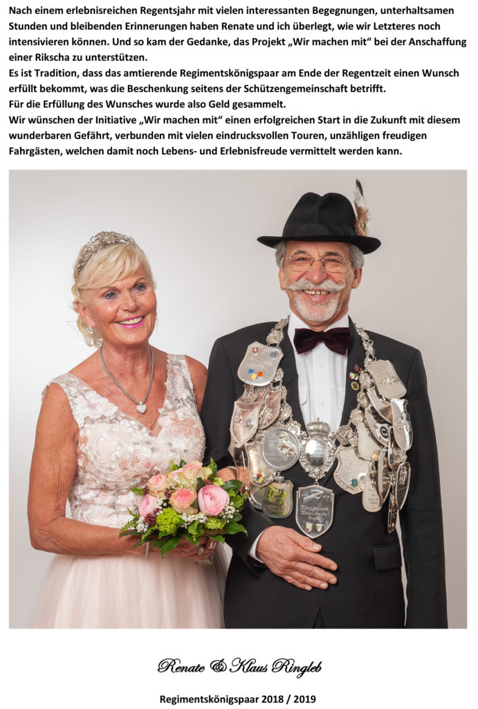 Herzlichen Dank an den St. Seb. Schützenverein Düsseldorf Wersten 1925 e.V. für die tolle Unterstützung! Die jährlich wechselnden Regiments-Königspaare setzen sich schon seid einigen Jahren dafür ein, dass Spendengelde für caritative Zwecke gesammelt werden. Das aktuelle Königspaar Renate und Klaus Ringleb möchte diese wunderbare Tradition nun fortsetzen und Spendengelder für die barrierefreie Quartiers-Rikscha sammeln. Wir finde die Idee großartig!