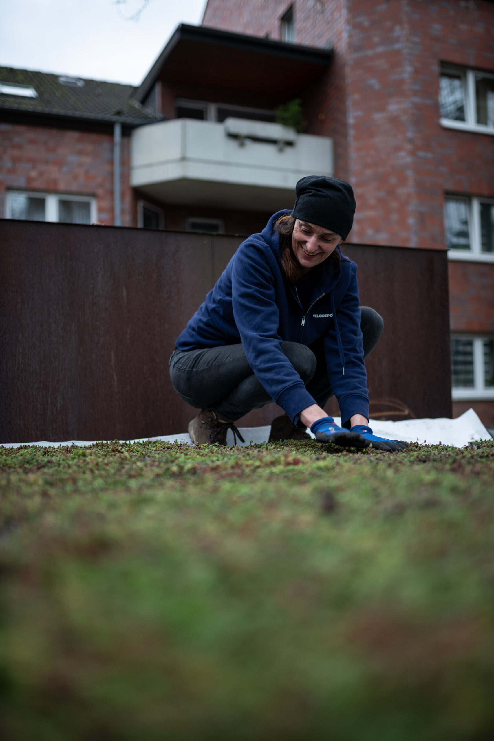 Die Doppelgarage mit ihren dunkelgrauen Verkleidungsplatten wird sich im Laufe der Zeit noch optisch anpassen und eine ähnliche Sichtbeschaffenheit annehmen wie die anderen Container auf dem Campus. Der Prozess dauert allerdings einige Monate und ist abhängig von der Menge an Regen, der die Oberflächenkorrosion begünstigt (Cortenstahl).